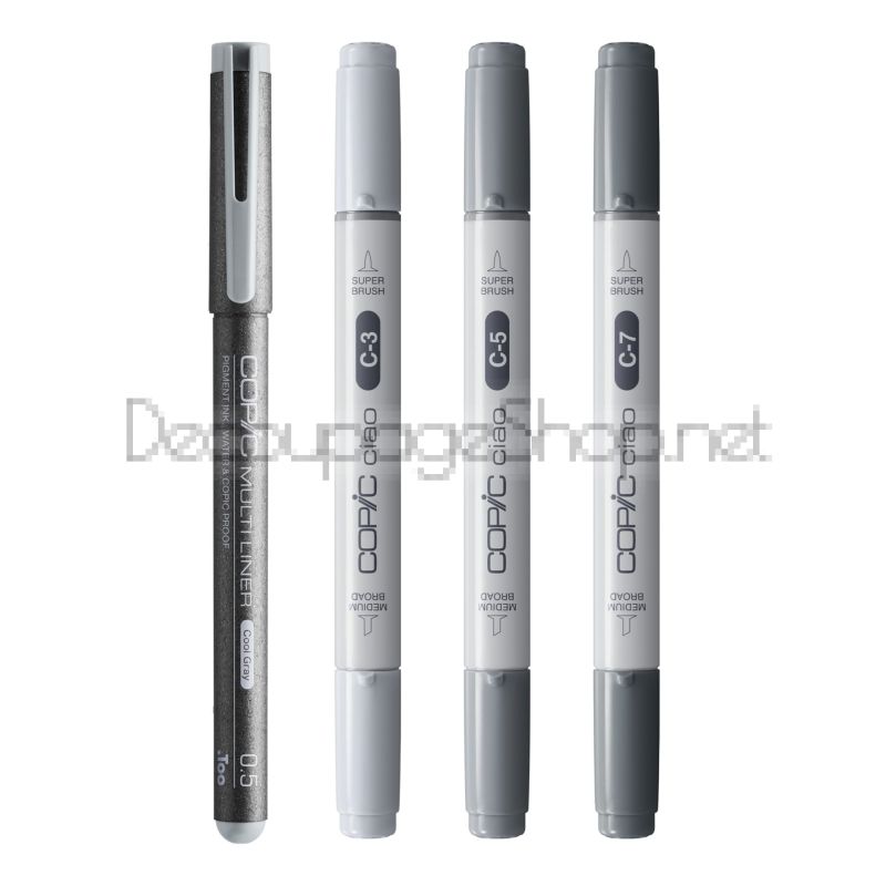 Малък комплект от 3 сиви алкохолни маркера Copic Ciao със студен синкав оттенък и сив тънкописец 0,5 mm.